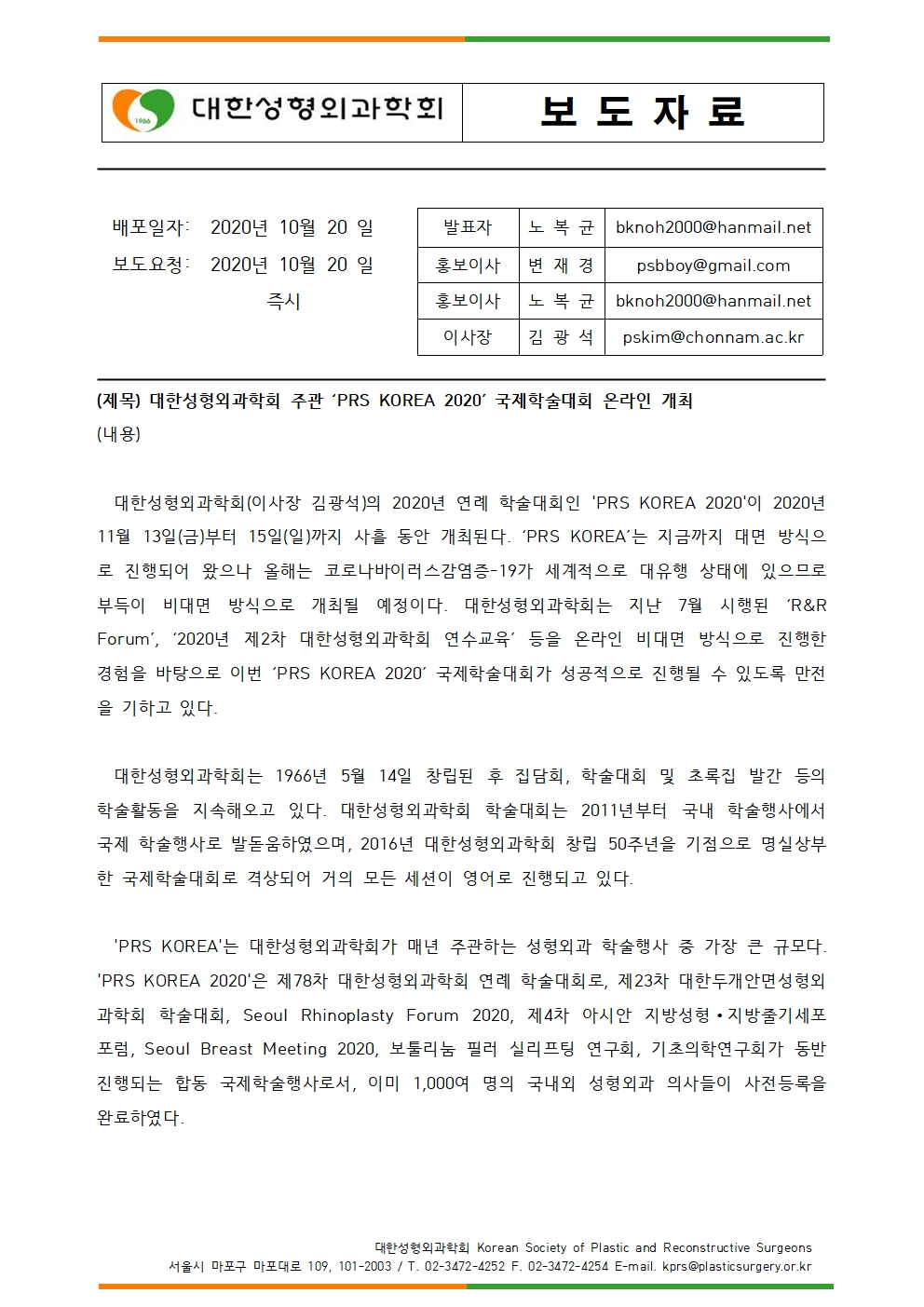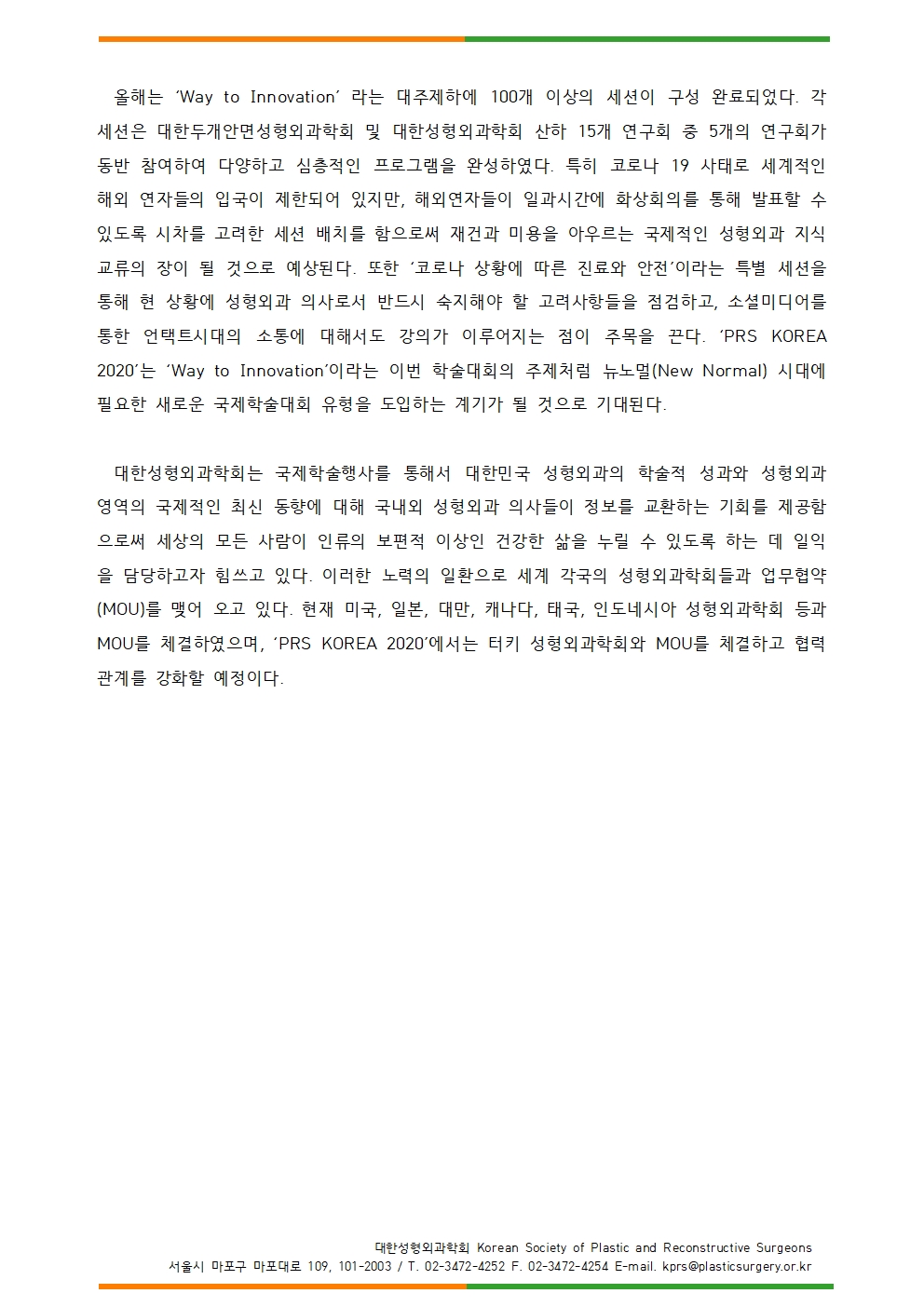 첨부파일 [대한성형외과학회] ‘PRS KOREA 2020’ 국제학술대회 온라인 개최 보도 자료 배포의 건.hwp [대한성형외과학회] ‘PRS KOREA 2020’ 국제학술대회 온라인 개최 보도 자료 배포의 건.hwp (다운751회)